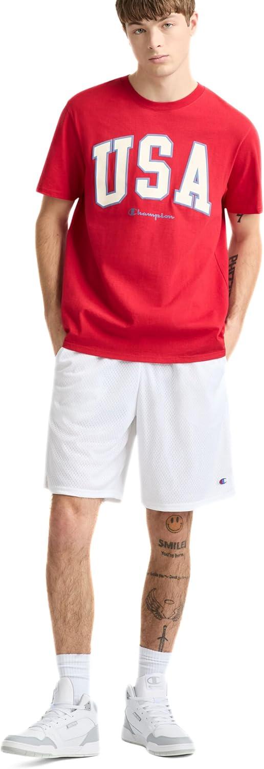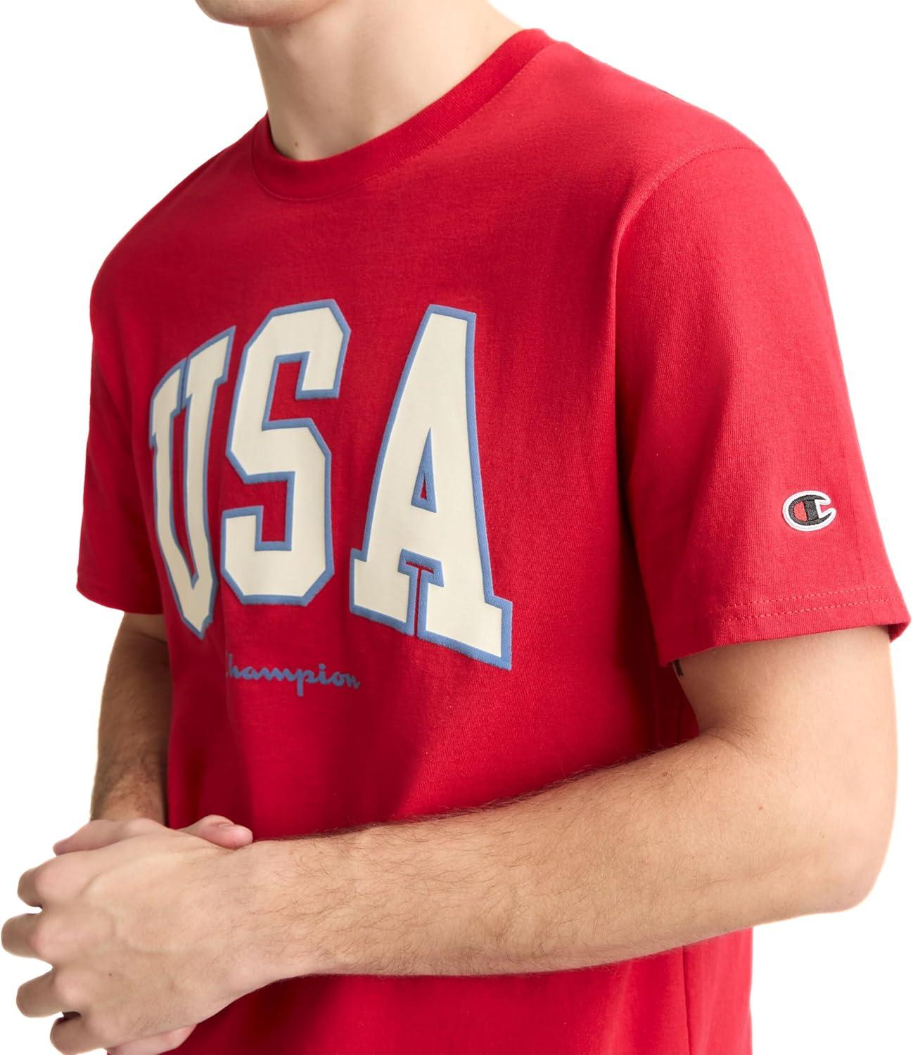 • Champion Men’s Heritage Short Sleeve Tee, Men’s T-Shirts, Vintage Shirts, Men’s Tee Shirts, Graphics(Spirited Red – Usa Block Logo)