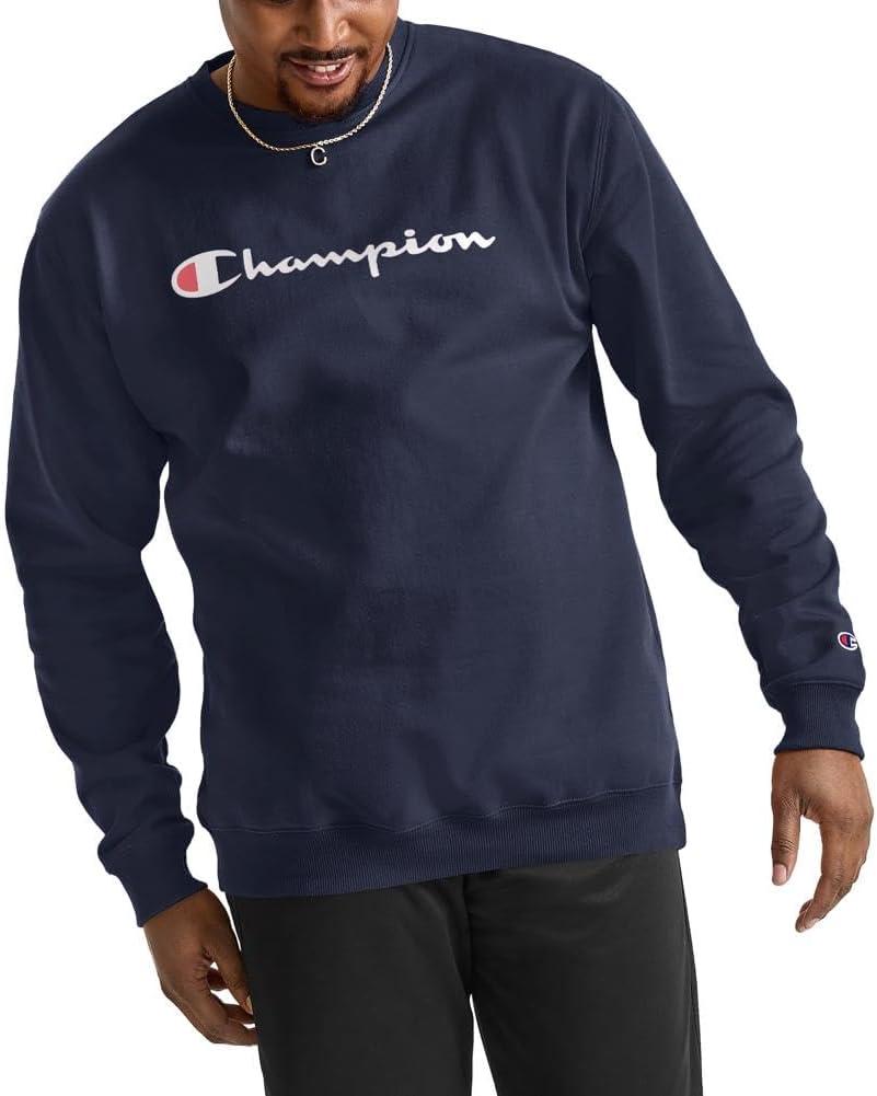 Champion Men’s Sweatshirt, Fleece Midweight Crewneck Sweatshirt (Reg. Or Big & Tall)(Navy – Classic Script Logo)