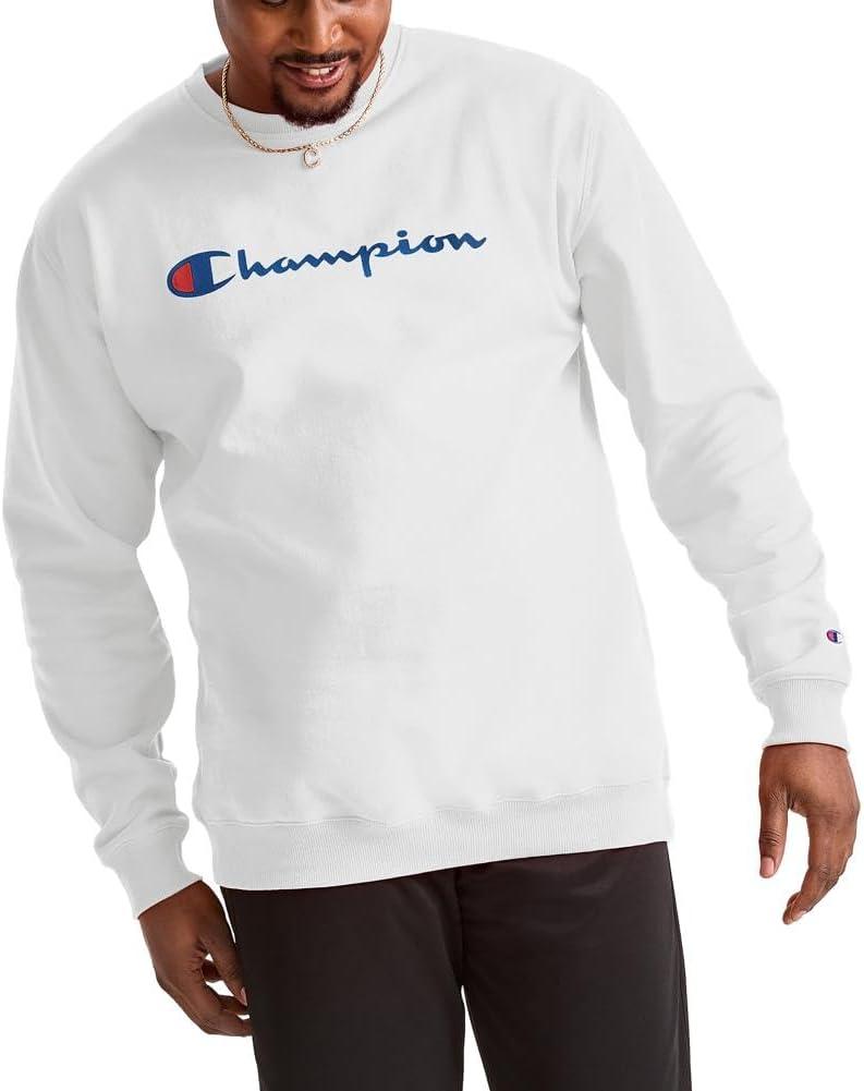 Champion Men’s Sweatshirt, Fleece Midweight Crewneck Sweatshirt (Reg. Or Big & Tall)(White – Classic Script Logo)