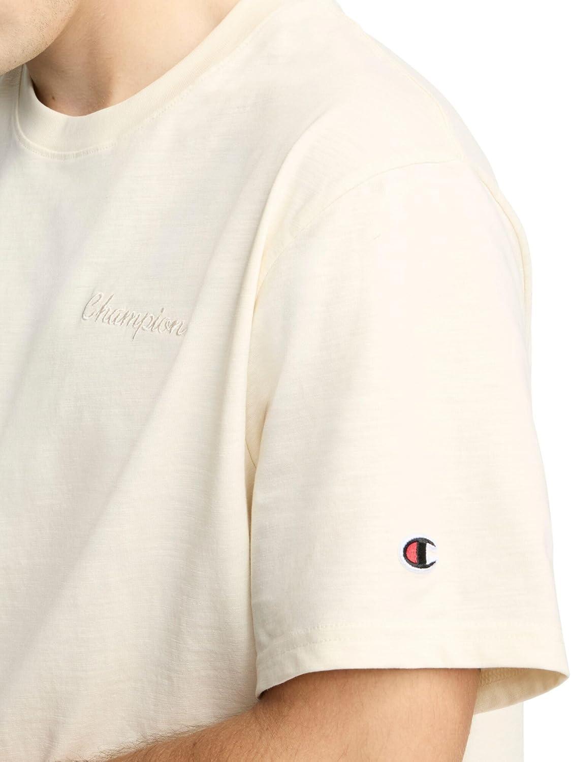Champion Men’s Curved Hem Slub T-Shirt, Embroidered Script(Champion Natural)