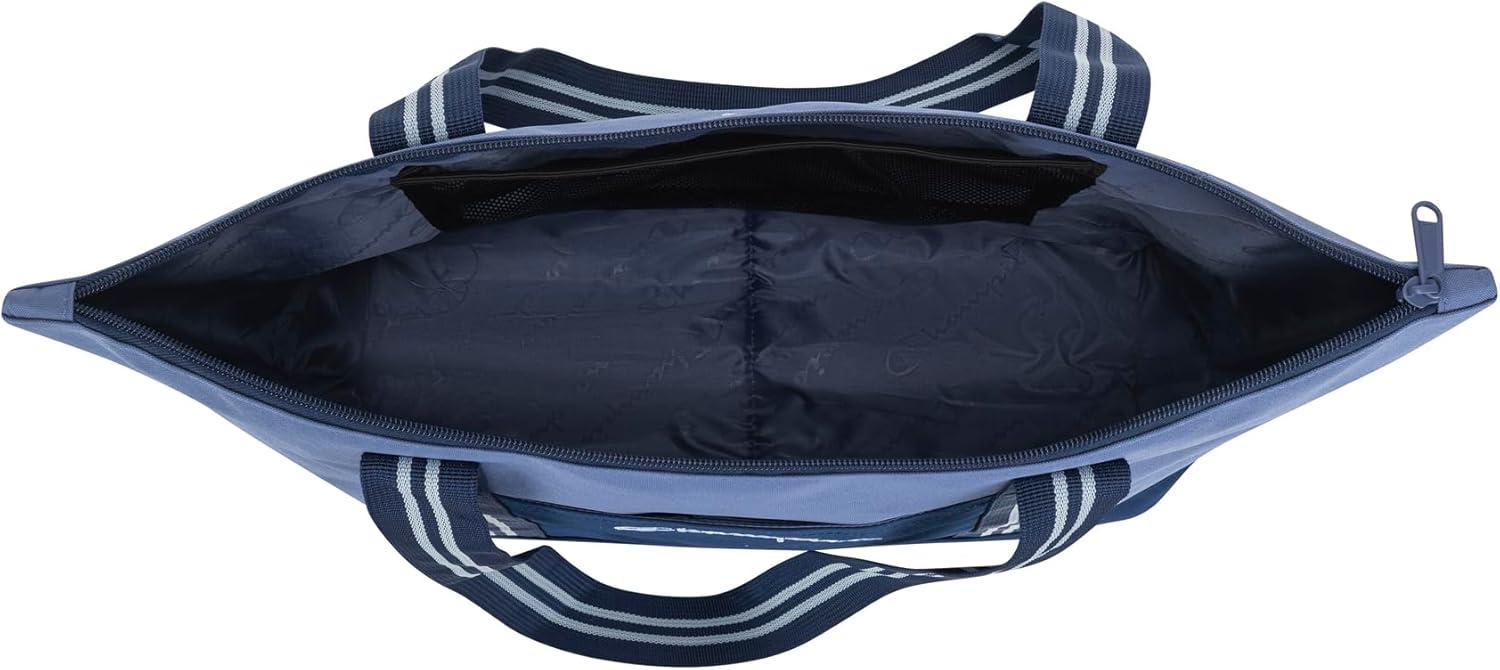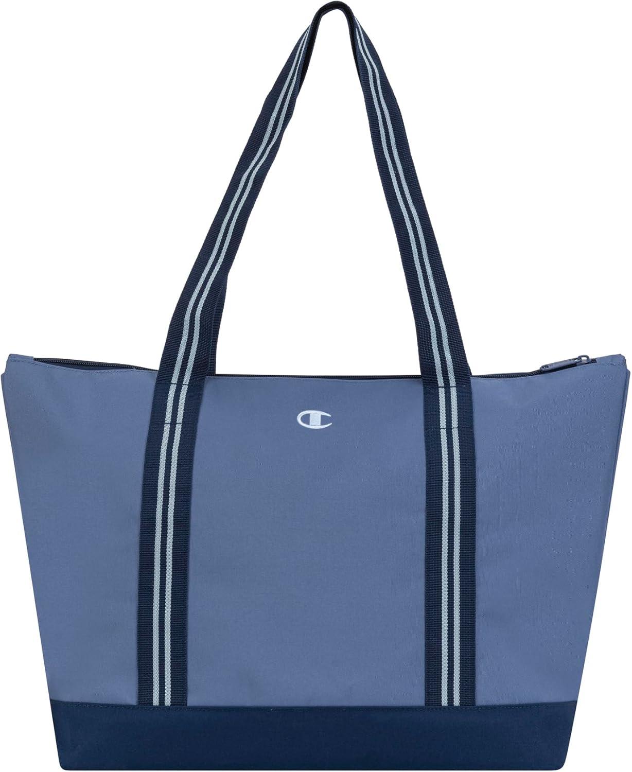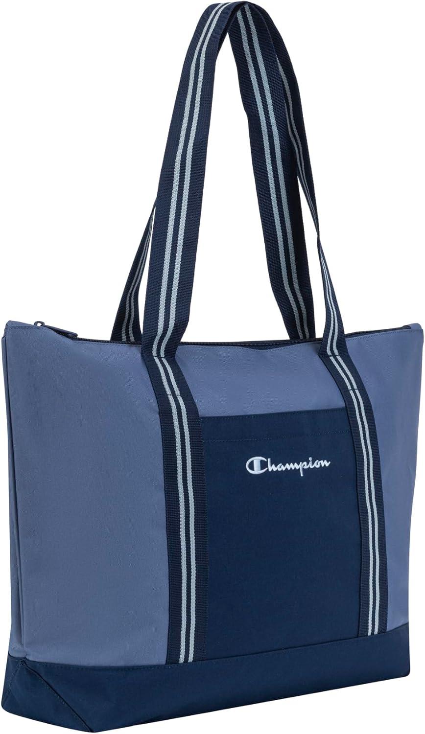 Champion Varsity Tote Bag with Zip Closure and Interior Mesh Pockets for Work, Travel, Daily Use, Our Favorite Fuchsia(Seven Seas Blue/Navy)