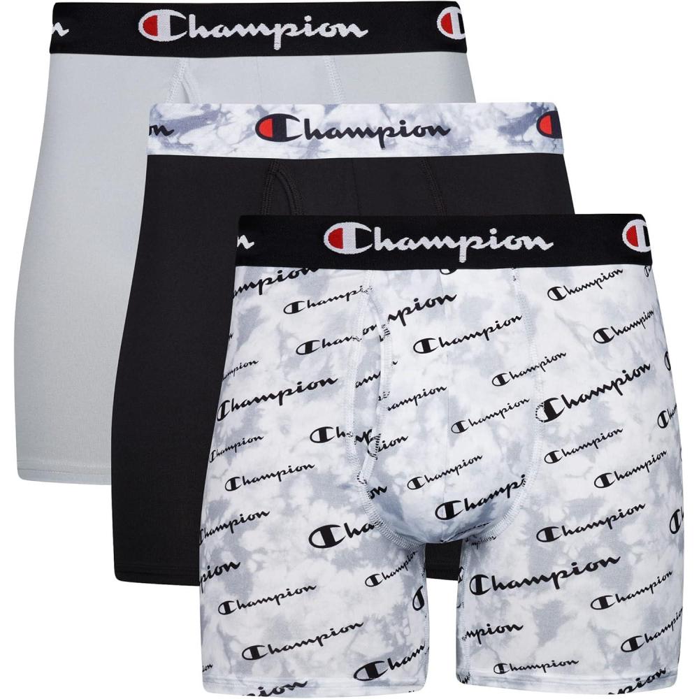 Champion mens Everyday Active Lightweight Stretch Variety Boxer Briefs – 3 Pack(Grey Print With Script Logo/New Ebony/Silverstone – 3 Pack)
