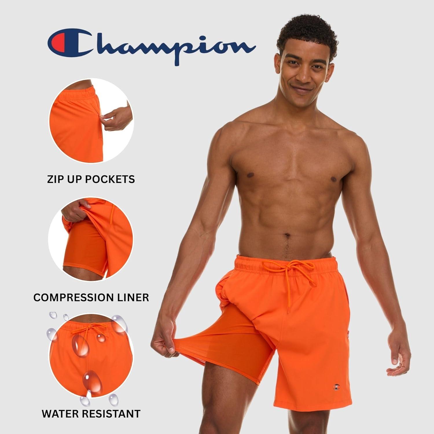 Champion Mens Swim Trunks with Compression Liner, 2 in 1 Mens Bathing Suit Shorts, 7 Inch Inseam Board Shorts for Swimming(Orange)