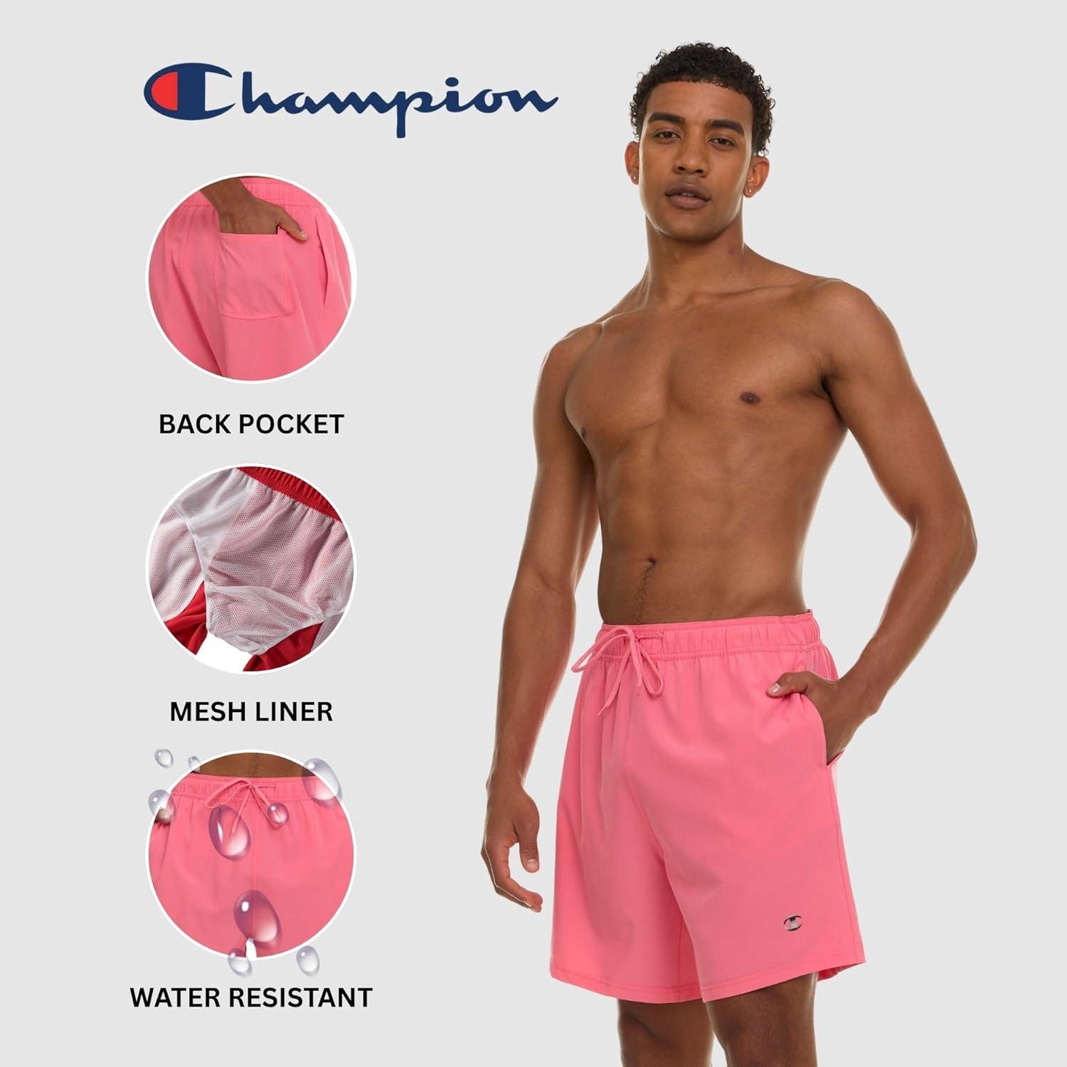 Champion Mens Swim Trunks with Mesh Liner, 7″ Inseam Quick Drying Mens Bathing Suit, Board Shorts for Swimming and Beach(Coral)