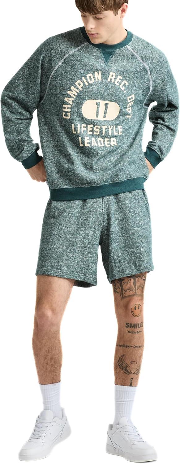 ALL ABOUT THE CREW If you're looking for the ideal pullover, look no further than this Sports & Rec Crewneck Sweatshirt for men. Crafted with soft airy blended fabric, this sporty design has a soft, brushed interior for warmth without weighing you down. The unique heathered look, contrast V-notch for a vintage style, and matching neck tape add to its signature appeal. The classic style is finished with a sports themed collegiate crest nestled under a bold Champion block graphic front and center with an iconic C patch on the left sleeve for an authentic touch. From joggers to shorts, this sweatshirt is the perfect match to your favorite Champion styles.