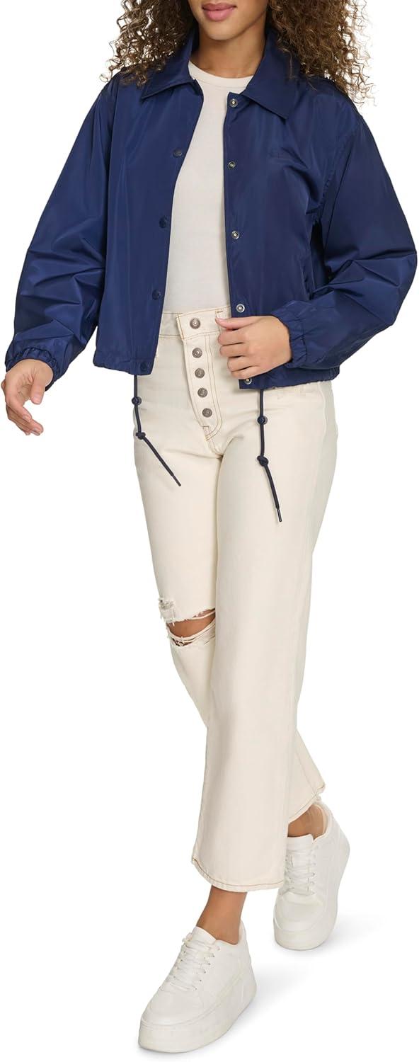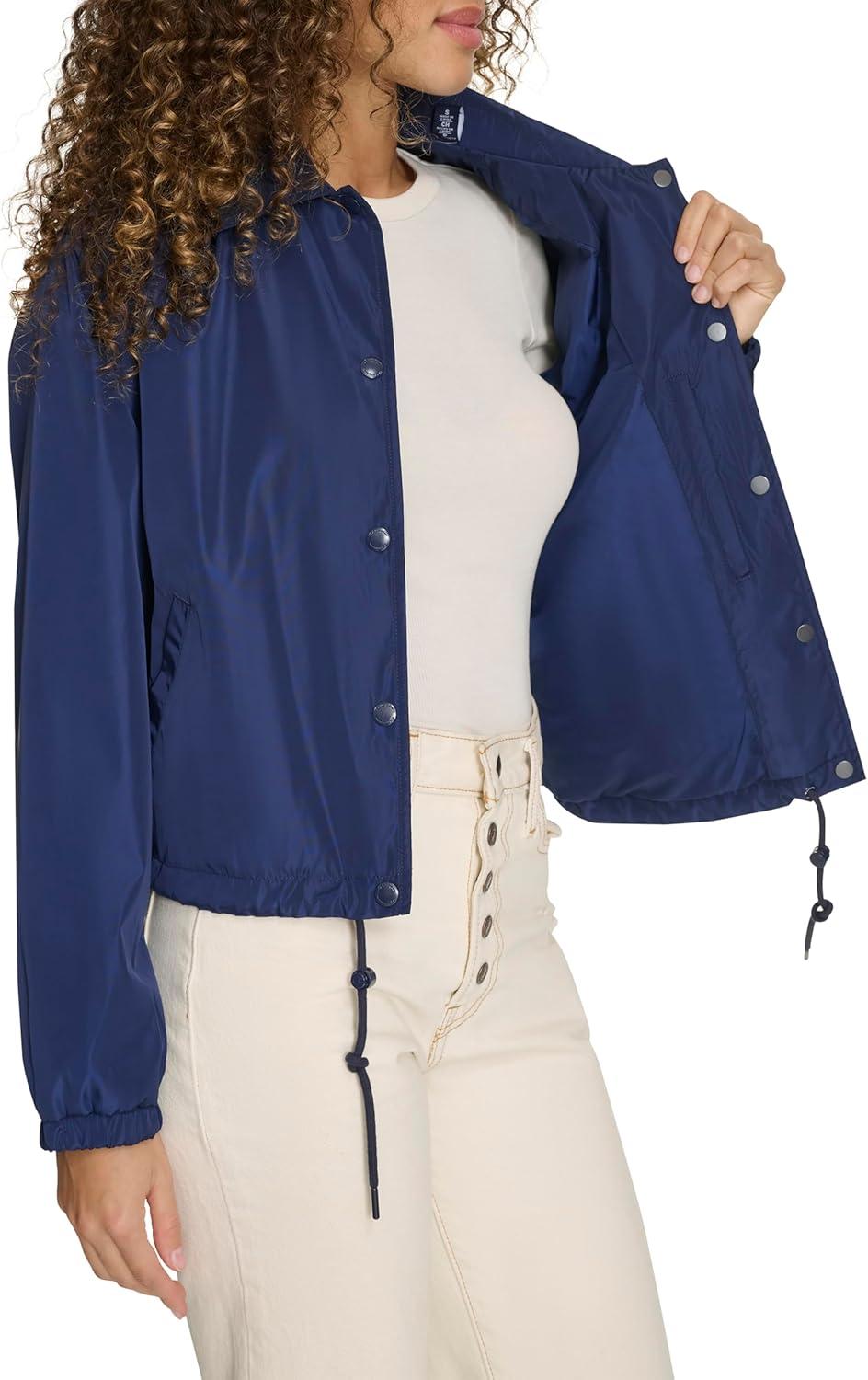 Snap Front Closure: Center front snap closure for easy wearing and a secure, adjustable fit. Practical Welt Pockets: Two lower welt pockets provide convenient storage for essentials while maintaining a sleek silhouette. Elastic Cuffs and Waistband: Elastic detailing at the cuffs and waistband ensures a snug, flattering fit and keeps out the elements. Customizable Fit: Draw cord at the hem allows for an adjustable fit, enhancing comfort and style. Sleek Satin Finish: Lightweight satin fabric gives the jacket a smooth, stylish look with a soft sheen.