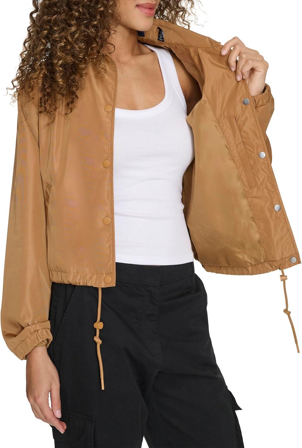 Snap Front Closure: Center front snap closure for easy wearing and a secure, adjustable fit. Practical Welt Pockets: Two lower welt pockets provide convenient storage for essentials while maintaining a sleek silhouette. Elastic Cuffs and Waistband: Elastic detailing at the cuffs and waistband ensures a snug, flattering fit and keeps out the elements. Customizable Fit: Draw cord at the hem allows for an adjustable fit, enhancing comfort and style. Sleek Satin Finish: Lightweight satin fabric gives the jacket a smooth, stylish look with a soft sheen.