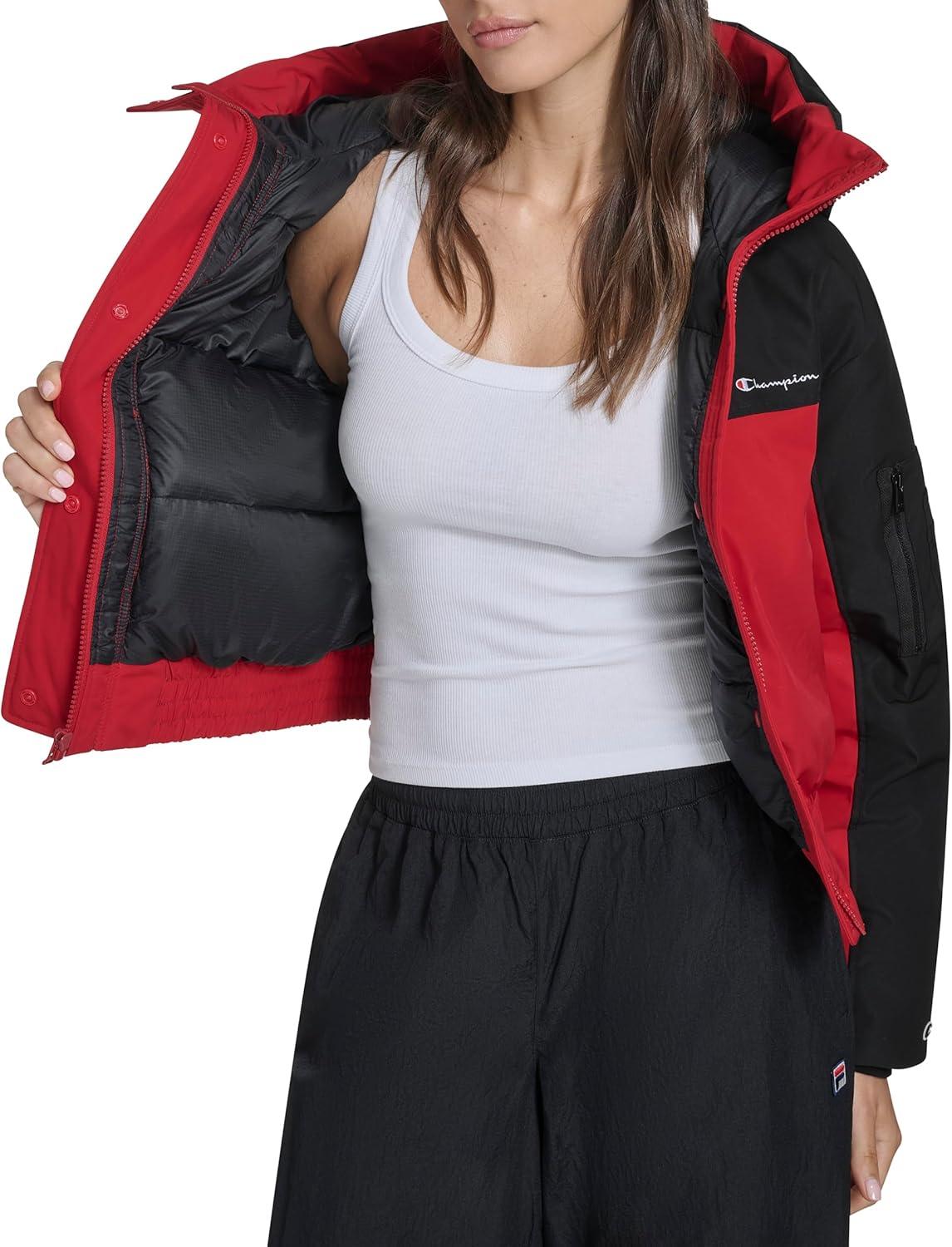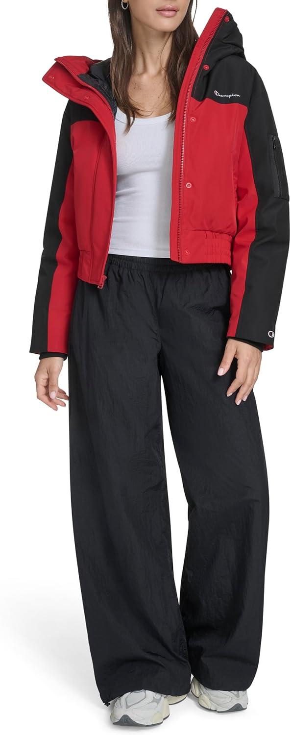 Champion womens Cropped Hooded Ski Bomber(Black/Red)