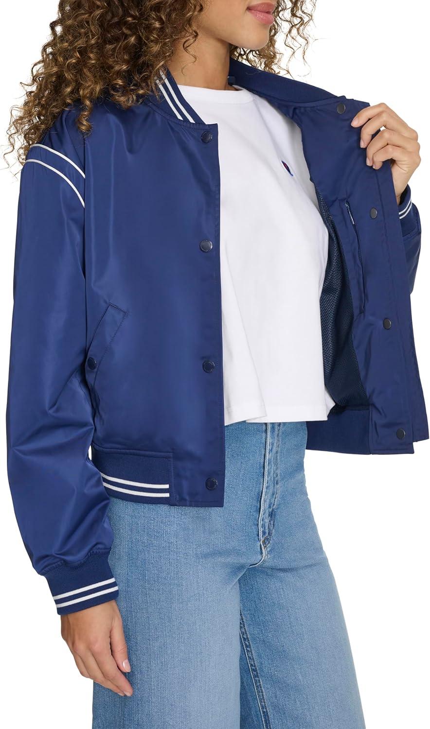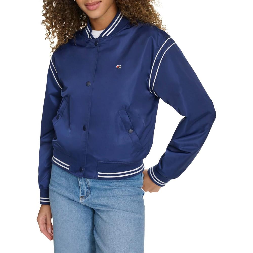 Dual Closure: Center front snap closure with hidden zipper offers a secure, adjustable fit. Functional Snap Pockets: Two lower snap pockets offer secure storage while maintaining the jacket’s sleek silhouette. Classic Varsity Details: Stripe rib knit at the cuffs, hem, and collar adds a timeless varsity-inspired touch. Chic Satin Fabric: Soft, lightweight satin gives the jacket a stylish, glossy finish for a modern, sporty look. Champion Branding: Features the iconic Champion logo at the chest for a bold, signature athletic style.