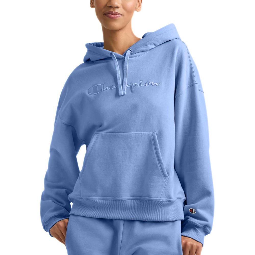 Champion Women’s Pullover Fleece Hoodie, Loose Fit, Midweight, Script Logo(Pewter Blue – Embroidered Script Logo)